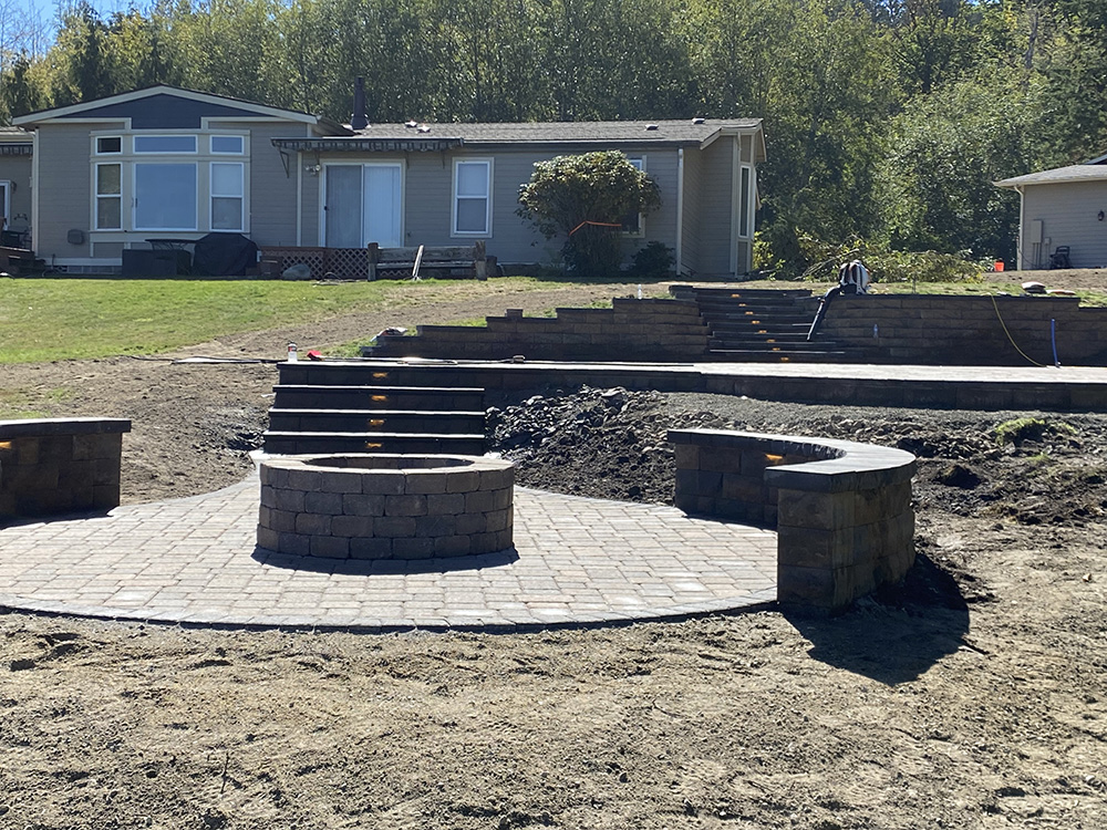Patio pavers, fire pit, seating bench, step pavers, and lighting installation